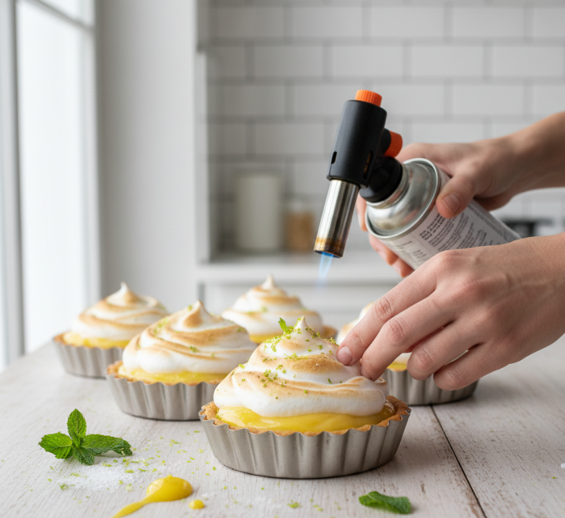 Preencha as bases de tartelete assadas e frias com o creme de limão já firme. Cubra o creme de limão com o merengue suíço. Você pode usar uma colher para fazer picos rústicos ou um saco de confeitar para um acabamento mais elegante. Para dourar o merengue, use um maçarico culinário. Se não tiver, leve ao forno pré-aquecido a 200°C (apenas na função grill, se tiver) por 2-3 minutos, monitorando de perto para não queimar. Leve à geladeira por pelo menos 30 minutos antes de servir.